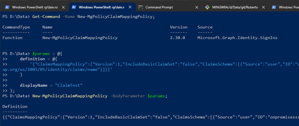 $params = @{ definition = @( '{"ClaimsMappingPolicy":{"Version":1,"IncludeBasicClaimSet":"false","ClaimsSchema":[{"Source":"user","ID":"onpremisesssamaccountname","SamlClaimType": "http://schemas.xmlsoap.org/ws/2005/05/identity/claims/name"}]}}' ) displayName = "ClaimTest" }