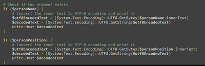 $url = "https://ww2.kanchanaburi.go.th/personal_board//?page=1&limit=99999" # Create a web request to fetch the HTML content and specify the character encoding $headers = @{ "Accept-Encoding" = "UTF-8" # Specify the correct encoding if needed } $response = Invoke-WebRequest -Uri $url -Headers $headers $htmlContent = $response.ParsedHtml $personBoxes = $htmlContent.getElementsByClassName("col-lg-12 person-box") # Loop through each "col-lg-12 person-box" element foreach ($personBox in $personBoxes) { $personName = $personBox.getElementsByClassName("d-flex flex-row row person-detail")[0] $personPosition = $personBox.getElementsByClassName("d-flex flex-row row person-detail")[2] if ($personName) { # Convert the inner text to UTF-8 encoding and print it $utf8EncodedText = [System.Text.Encoding]::UTF8.GetBytes($personName.innerText) $decodedText = [System.Text.Encoding]::UTF8.GetString($utf8EncodedText) Write-Host $decodedText } if ($personPosition) { $utf8EncodedText = [System.Text.Encoding]::UTF8.GetBytes($personPosition.innerText) $decodedText = [System.Text.Encoding]::UTF8.GetString($utf8EncodedText) Write-Host $decodedText } }YeuHarng You could gather the information in a pscustomobject and write it to an Excel file, something like this: