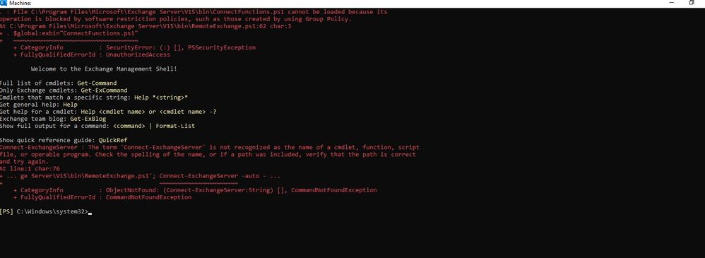 Despite this configuration, Exchange PowerShell scripts such as RemoteExchange.ps1, CommonConnectFunctions.ps1 and ps1xml files are still blocked and Exchange cmdlets are not available.