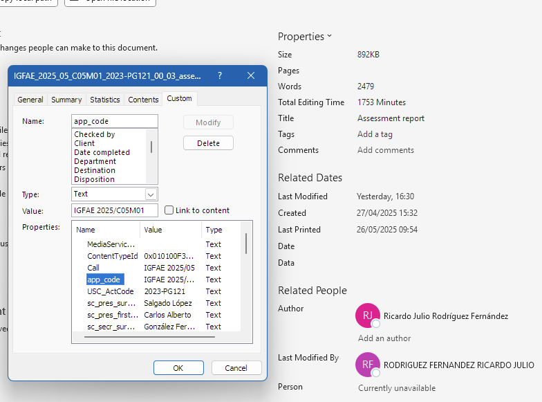PS C:\Users\ricar> . 'C:\Users\ricar\OneDrive\Documents\Downloads\listAllProperties.ps1' Attempting to retrieve properties for: C:\Users\ricar\OneDrive\Documents\Downloads\IGFAE_2025_05_C05M01_2023-PG121_00_03_assessment_report.docx Document opened successfully. Retrieving properties... ------------------------------ Built-In Document Properties: ------------------------------ Custom Document Properties: No custom properties found. ------------------------------ All Properties (Table Format): Name Value Type ---- ----- ---- Built-in Built-in Built-in Built-in Built-in ... Built-in Built-in Built-in Built-in Built-in Script finished. PS C:\Users\ricar>Could you send to me a docx file working for you? Could you figure out why I'm getting of apparently empty and unnamed built-in properties and zero custom properties?