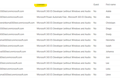 In the Active user list (https://admin.microsoft.com/#/users) you can also find a column Licenses. This gives all licenses assigned to the user like this way: Microsoft 365 E3,PowerBiPro,Defender for Endpoint P1. Currently I have this code to get a list of the different properties, and this works fine. But I miss the object "Licenses".