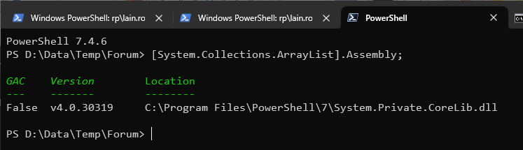 [System.Collections.ArrayList].Assembly;On PowerShell 7.4.6 on Windows 10 22H2, I get the following output, which confirms that the type exists as well as the version and path to the underpinning library.