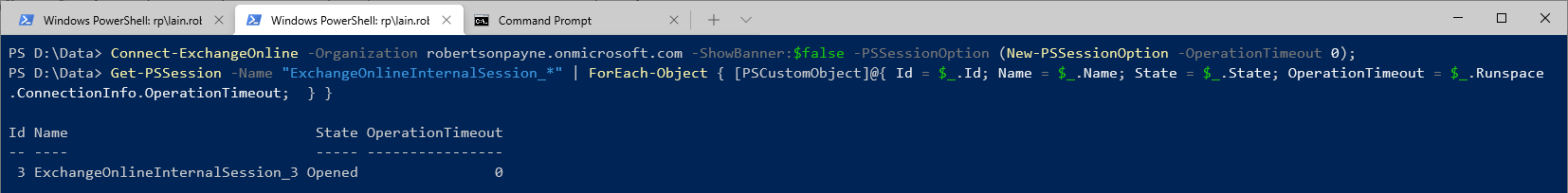 Connect-ExchangeOnline -Organization robertsonpayne.onmicrosoft.com -ShowBanner:$false -PSSessionOption (New-PSSessionOption -OperationTimeout 0);If you re-run the checking process, you should find you get output like this: