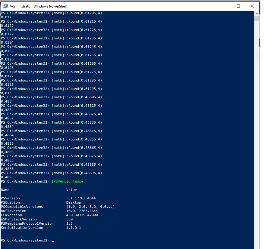 PS C:\bin\git> $n = 74.35715 PS C:\bin\git> PS C:\bin\git> for ($i = 0; $i -lt 100; $i++) { write-host "For $n the rounding is: "+([math]::Round($n, 4)) $n = $n + 0.0001; $n = [math]::Round($n, 5) } For 74.35715 the rounding is: + 74,3572 For 74.35725 the rounding is: + 74,3572 For 74.35735 the rounding is: + 74,3574 For 74.35745 the rounding is: + 74,3574 For 74.35755 the rounding is: + 74,3576 For 74.35765 the rounding is: + 74,3577 For 74.35775 the rounding is: + 74,3578 For 74.35785 the rounding is: + 74,3578 For 74.35795 the rounding is: + 74,358 For 74.35805 the rounding is: + 74,358 For 74.35815 the rounding is: + 74,3582 For 74.35825 the rounding is: + 74,3582 For 74.35835 the rounding is: + 74,3584 For 74.35845 the rounding is: + 74,3584 For 74.35855 the rounding is: + 74,3585 For 74.35865 the rounding is: + 74,3586 For 74.35875 the rounding is: + 74,3588 For 74.35885 the rounding is: + 74,3588 For 74.35895 the rounding is: + 74,3589 For 74.35905 the rounding is: + 74,359 For 74.35915 the rounding is: + 74,3592 For 74.35925 the rounding is: + 74,3592 For 74.35935 the rounding is: + 74,3594 For 74.35945 the rounding is: + 74,3594 For 74.35955 the rounding is: + 74,3596 For 74.35965 the rounding is: + 74,3596 For 74.35975 the rounding is: + 74,3598 For 74.35985 the rounding is: + 74,3598 For 74.35995 the rounding is: + 74,36 For 74.36005 the rounding is: + 74,36 For 74.36015 the rounding is: + 74,3602 For 74.36025 the rounding is: + 74,3602 For 74.36035 the rounding is: + 74,3604 For 74.36045 the rounding is: + 74,3604 For 74.36055 the rounding is: + 74,3606 For 74.36065 the rounding is: + 74,3607 For 74.36075 the rounding is: + 74,3608 For 74.36085 the rounding is: + 74,3608 For 74.36095 the rounding is: + 74,361 For 74.36105 the rounding is: + 74,3611 For 74.36115 the rounding is: + 74,3612 For 74.36125 the rounding is: + 74,3612 For 74.36135 the rounding is: + 74,3614 For 74.36145 the rounding is: + 74,3614 For 74.36155 the rounding is: + 74,3615 For 74.36165 the rounding is: + 74,3616 For 74.36175 the rounding is: + 74,3618 For 74.36185 the rounding is: + 74,3618 For 74.36195 the rounding is: + 74,3619 For 74.36205 the rounding is: + 74,362 For 74.36215 the rounding is: + 74,3622 For 74.36225 the rounding is: + 74,3622 For 74.36235 the rounding is: + 74,3624 For 74.36245 the rounding is: + 74,3624 For 74.36255 the rounding is: + 74,3626 For 74.36265 the rounding is: + 74,3626 For 74.36275 the rounding is: + 74,3628 For 74.36285 the rounding is: + 74,3628 For 74.36295 the rounding is: + 74,363 For 74.36305 the rounding is: + 74,363 For 74.36315 the rounding is: + 74,3632 For 74.36325 the rounding is: + 74,3632 For 74.36335 the rounding is: + 74,3634 For 74.36345 the rounding is: + 74,3634 For 74.36355 the rounding is: + 74,3636 For 74.36365 the rounding is: + 74,3637 For 74.36375 the rounding is: + 74,3638 For 74.36385 the rounding is: + 74,3638 For 74.36395 the rounding is: + 74,364 For 74.36405 the rounding is: + 74,3641 For 74.36415 the rounding is: + 74,3642 For 74.36425 the rounding is: + 74,3642 For 74.36435 the rounding is: + 74,3644 For 74.36445 the rounding is: + 74,3644 For 74.36455 the rounding is: + 74,3645 For 74.36465 the rounding is: + 74,3646 For 74.36475 the rounding is: + 74,3648 For 74.36485 the rounding is: + 74,3648 For 74.36495 the rounding is: + 74,3649 For 74.36505 the rounding is: + 74,365 For 74.36515 the rounding is: + 74,3652 For 74.36525 the rounding is: + 74,3652 For 74.36535 the rounding is: + 74,3654 For 74.36545 the rounding is: + 74,3654 For 74.36555 the rounding is: + 74,3656 For 74.36565 the rounding is: + 74,3656 For 74.36575 the rounding is: + 74,3658 For 74.36585 the rounding is: + 74,3658 For 74.36595 the rounding is: + 74,366 For 74.36605 the rounding is: + 74,366 For 74.36615 the rounding is: + 74,3662 For 74.36625 the rounding is: + 74,3662 For 74.36635 the rounding is: + 74,3664 For 74.36645 the rounding is: + 74,3664 For 74.36655 the rounding is: + 74,3666 For 74.36665 the rounding is: + 74,3667 For 74.36675 the rounding is: + 74,3668 For 74.36685 the rounding is: + 74,3668 For 74.36695 the rounding is: + 74,367 For 74.36705 the rounding is: + 74,3671