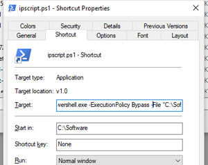 Hello all, I am attempting to have a powershell script run as a shortcut to output some simple information to a text file. I have created this one line script named ipscript.ps1 get-netipaddr...