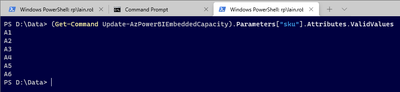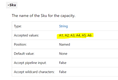 Update-AzureRmPowerBIEmbeddedCapacity : Cannot validate argument on parameter 'Sku'. The argument "A7" does not belong to the set "A1,A2,A3,A4,A5,A6" specified by the ValidateSet attribute. Supply an argument that is in the set and then try the command again. At line:70 char:121 + ... -Name $pbiEmbCap.Name -ResourceGroupName $resourceGroupName -Sku $sku + ~~~~ + CategoryInfo : InvalidData: (:) [Update-AzureRmPowerBIEmbeddedCapacity], ParameterBindingValidationException + FullyQualifiedErrorId : ParameterArgumentValidationError,Microsoft.Azure.Commands.PowerBI.UpdateAzurePowerBIEmbeddedCapacity
