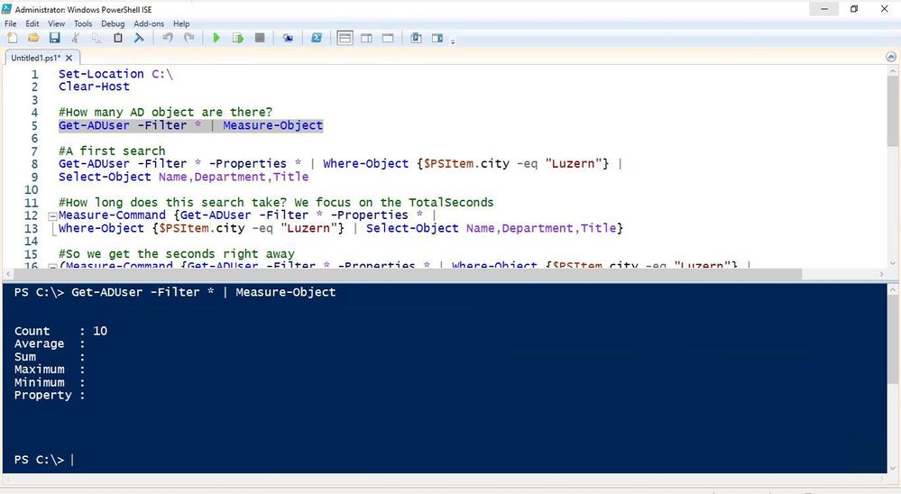 (Measure-Command {Get-ADUser -Filter {city -eq "Luzern"} -Properties Name,Department,Title | Select-Object Name,Department,Title}).TotalSeconds