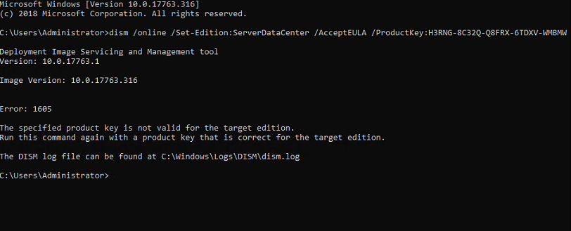 dism /online /Set-Edition:ServerDataCenter /AcceptEULA /ProductKey:H3RNG-8C32Q-Q8FRX-6TDXV-WMBMW