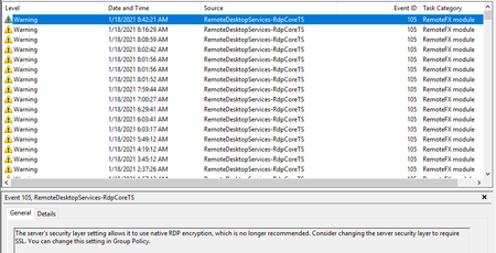 Getting a lot of WARNINGS on my Terminal Server running Windows Server 2016. Do I need to be concerned? Is there something I need to do to fix these warnings? Thank you.   Event ID 105 - RemoteDesk...