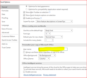 We have Office 2019 installed in Windows 2016 server. For few users, Excel always shows particular user(User who installed office) name under File--> Options-->General-->User Name. It's not happening...