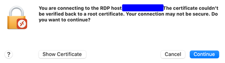 Hi developers of the Microsoft Remote Desktop client for MacOS, Could you please stop annoying your users with displaying the same GUI popup below noting: "You are connecting to the RDP host "A....
