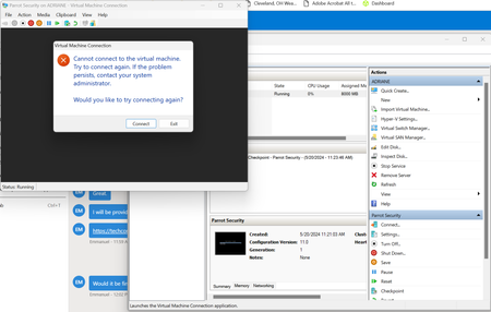 I'm on Windows 11 Pro (Client) version 23H2 host and have tried creating multiple different guest OS machines all with the same error, "Cannot Connect to the Virtual Machine." However, when I power o...