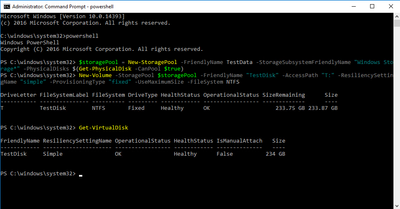New-Volume -StoragePool $storagePool -FriendlyName "TestDisk" -AccessPath "T:" -ResiliencySettingName "simple" -ProvisioningType "fixed" -UseMaximumSize -FileSystem NTFS