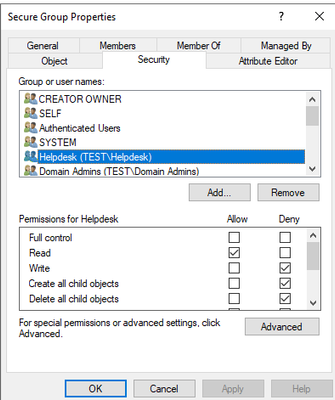 Hello, I have been looking around for the best way to lock down an AD security group so that help desk users for instance, cannot add users to a specific AD group. So if I had a group called "secure_group" I would like to lock that down to that only domain admins and specific other users can add members to that group and prevent help desk users from adding users to that group.