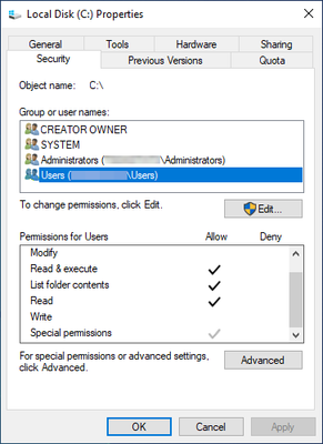 If i were you, i would not play with the permission on the drive "c", because if you mess with this, you could mess with the "c:\users" and thing could be turn really bad.
