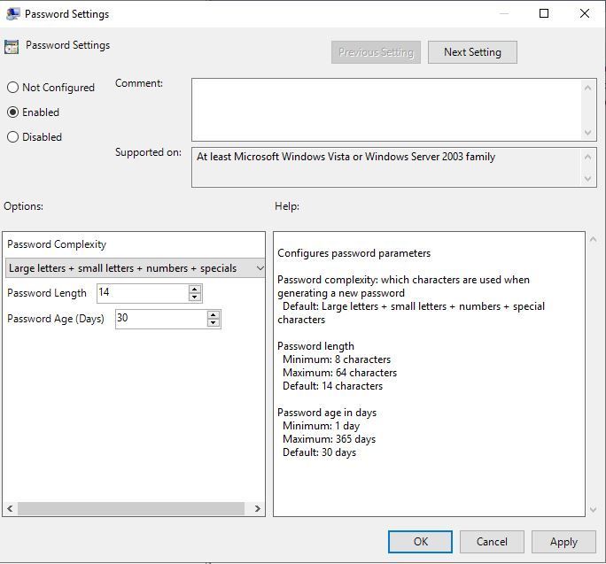 By default this solution uses a password with maximum password complexity, 14 characters and changes the password every 30 days. You can change the values to suit your needs by editing a Group Policy.
