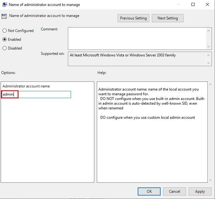If you have decided to manage custom local Administrator account, you must specify its name in Group Policy (In my example it is admin).