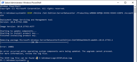 Every time I try to upgrade our evaluation datacenter I get this error. DISM.log 2023-05-10 13:32:23, Info DISM PID=1812 TID=2520 Scratch directory set to 'C:\Users\sajellis\AppData\Local\Tem...