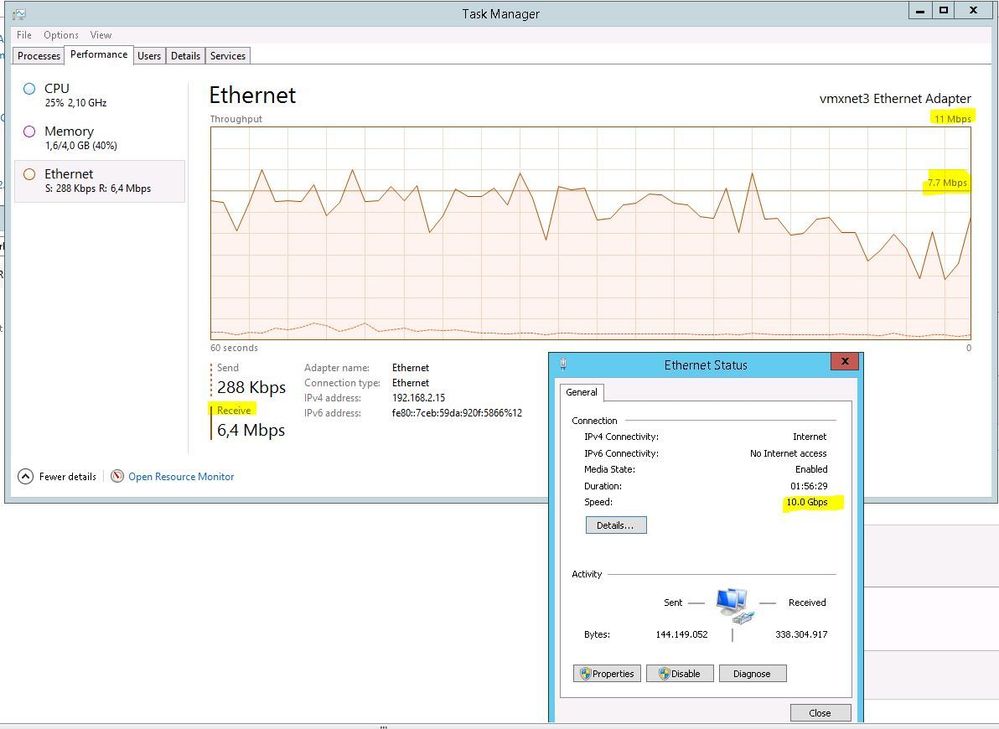 Hello, I hope that somebody help me. I have the followin problem with a server windows 2012 r2, which has the service of IIS 8, with PHP 5.6.32. When clicking a page that makes a query to a MSSQL DB that is in another server, in the network connection statistics, in the received data it appears that the server was preventing the use of all bandwidth, because of the 10 Gbps it has the connection limits the reception of data to about 7Mbps and does not allow use more than that limit, making it take more than 130 seconds to load that page. On the other hand I built the same environment but with an IIS 7 in windos 2008 r2, and there it took only 10 seconds to load the page, using up to 200Mbps.