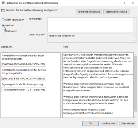 Hi, I have configured GPO for WHfB in the way, that 2 factors are needed for login. 1st factor is facial recognition or fingerprint. Second factor is PIN or signalling. Each entries are seperated...