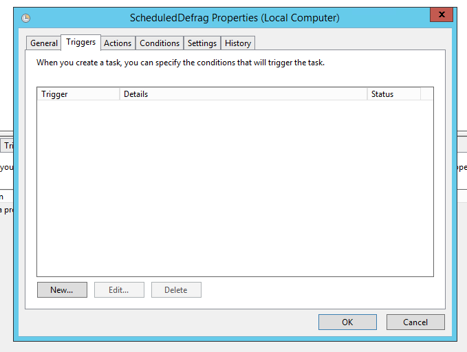 In general, some other scheduled task (don't know which) runs ScheduledDefrag. That is why its triggers are empty. I suppose, with some care, triggers could be added. It is too bad that Microsoft allows but doesn't show such cascaded schedules.