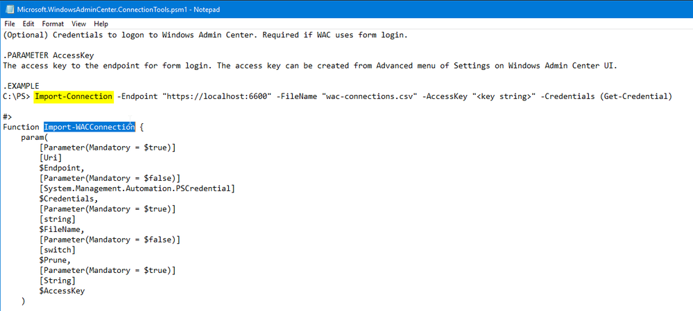 To say nothing about the fact that the .psm1 file has conflicting text in the example, vs the functions. What is it; Import-WACConnection, or Import-Connection, Microsoft?!?
