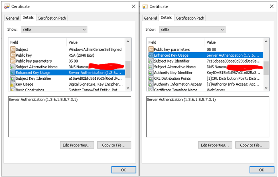 The SAN must include the FQDN you use to access WAC and optionally the server hostname. - The certificate must include the Server Authentication Enhanced Key Usage.