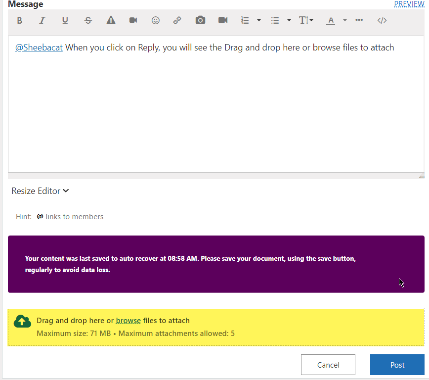 Sheebacat When you click on Reply, you will see the facility hight lighted in yellow by which you can Drag and drop here or browse files to attach.