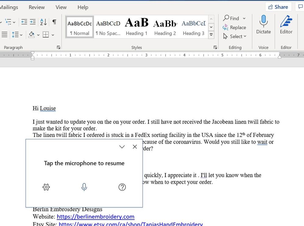 Today I was on a messaging help desk and using dictate in Word to copy the message to the technician and suddenly the dictate toolbar box stopped popping up in that one Word document and I have no idea why this happened. I was not in any of the settings for Word, I was just using dictating.