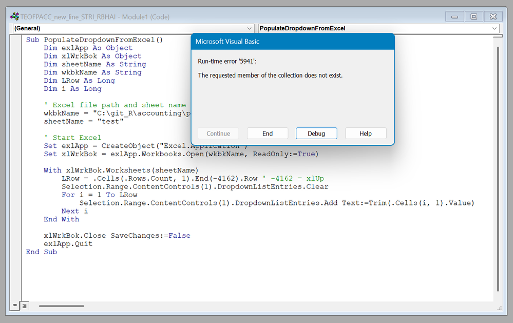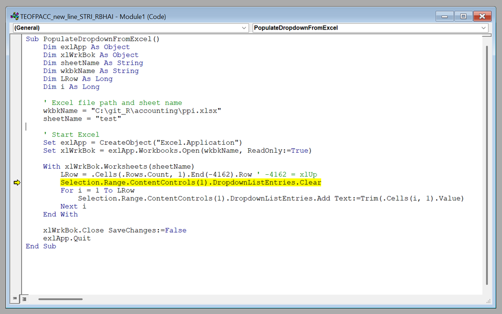 Sub PopulateDropdownFromExcel() Dim exlApp As Object Dim xlWrkBok As Object Dim sheetName As String Dim wkbkName As String Dim LRow As Long Dim i As Long ' Excel file path and sheet name wkbkName = "C:\Path\To\Your\File.xlsx" sheetName = "Sheet1" ' Start Excel Set exlApp = CreateObject("Excel.Application") Set xlWrkBok = exlApp.Workbooks.Open(wkbkName, ReadOnly:=True) With xlWrkBok.Worksheets(sheetName) LRow = .Cells(.Rows.Count, 1).End(-4162).Row ' -4162 = xlUp Selection.Range.ContentControls(1).DropdownListEntries.Clear For i = 1 To LRow Selection.Range.ContentControls(1).DropdownListEntries.Add Text:=Trim(.Cells(i, 1).Value) Next i End With xlWrkBok.Close SaveChanges:=False exlApp.Quit End Sub