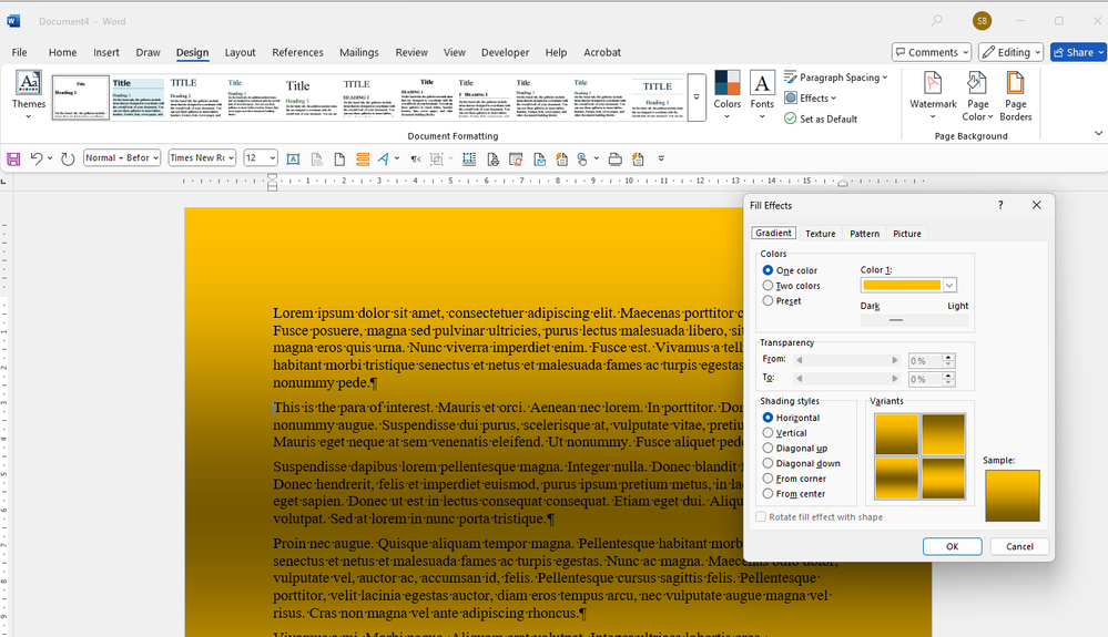 I'm trying to apply a fill effects Gradient therefore I go to Design > Page Color > Fill Effects but when I click OK it's not applied to the page ?