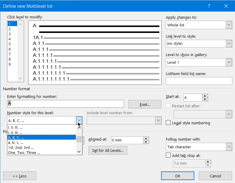lucahuenicke In the Define New Multilevel List dialog, change the Number style for the Level 1 numbering to A, B, C, ...