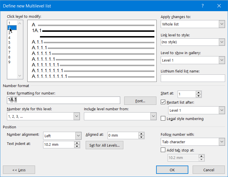 Then move back to the Level 1 and change the Number style back to 1, 2, 3, ...