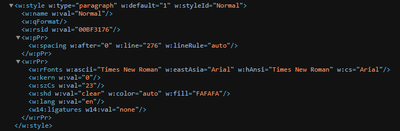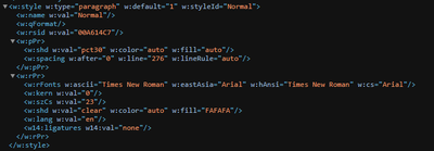 But when I opened the file, it was back to its old shenanigans. I saved the file again as a different filename and hacked into the file again. The <w:shd> element had re-set itself. And sure enough, there are now two <w:shd> elements in the "Normal" style.