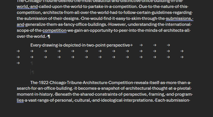 It appears you were working in Microsoft Word or a comparable word processing application and may have inadvertently activated the “Separate Pages” layout or inserted a section/page break, which altered the structure of your document. The arrows you are seeing (→) are most likely tab characters or formatting symbols that become visible when the “Show/Hide ¶” option is enabled.