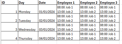 I want to be able to group by Staff Member so that all the jobs are shown together for each date I.e. Staff Member 1 - Monday 01/01/2024 08:00 Job 1 13:00 Job 2 / Tuesday 02/01/2024 - 08:00 Job 1 13:00 Job 2 / Wednesday 03/01/2024 08:00 Job 1 13:00 Job 2 Thursday 04/01/2024 - 08:00 Job 1 13:00 Job 2 then Staff Member 2 - Monday 01/01/2024 08:00 Job 1 13:00 Job 2 / Tuesday 02/01/2024 - 08:00 Job 1 13:00 Job 2 / Wednesday 03/01/2024 08:00 Job 1 13:00 Job 2 Thursday 04/01/2024 - 08:00 Job 1 13:00 Job 2 etc.