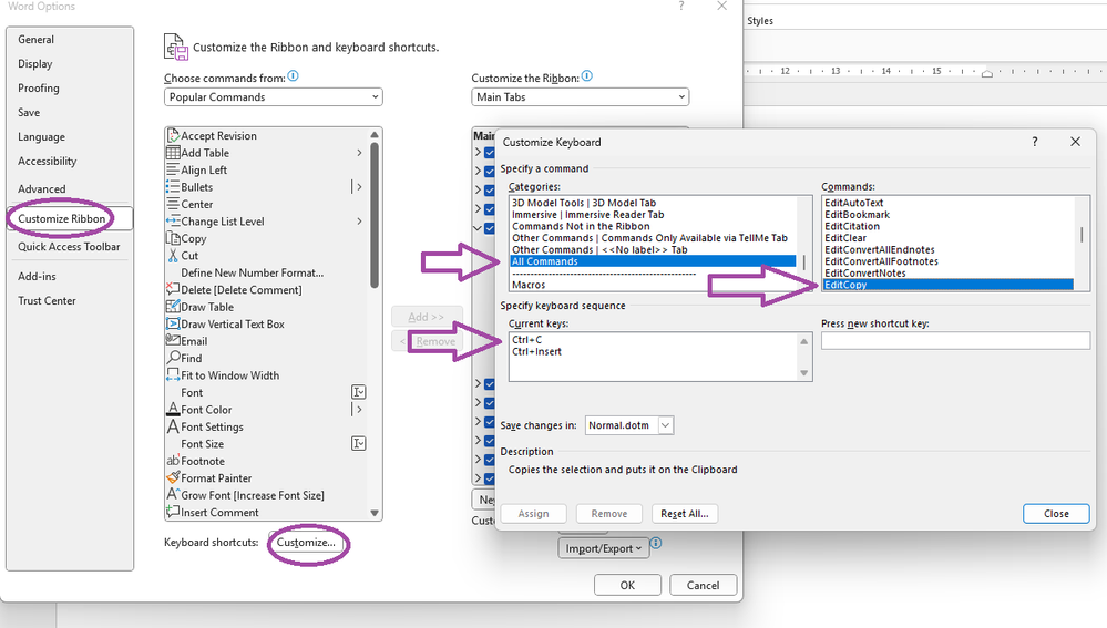 I cannot use control+c, control+v, control+z, control+y, control+x or control+a on Word on my new computer. when checking Customize shortcut keys in options->customize ribbon, These keys are not assigned to any command, and the relevant commands (undo, redo, copy, paste etc.) do not appear at all, not inder "all commands" and not anywhere else. They do appear in the customize ribbon.