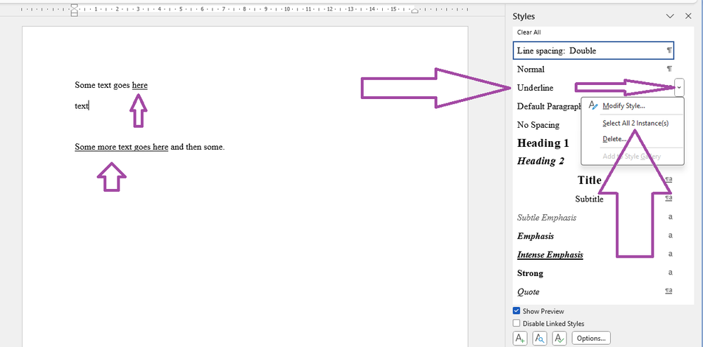 Word has some tools to help simplify the job, though. In Word for Windows, you can instruct the Styles pane to show direct formatting as styles and then you can select that direct formatting in one go.