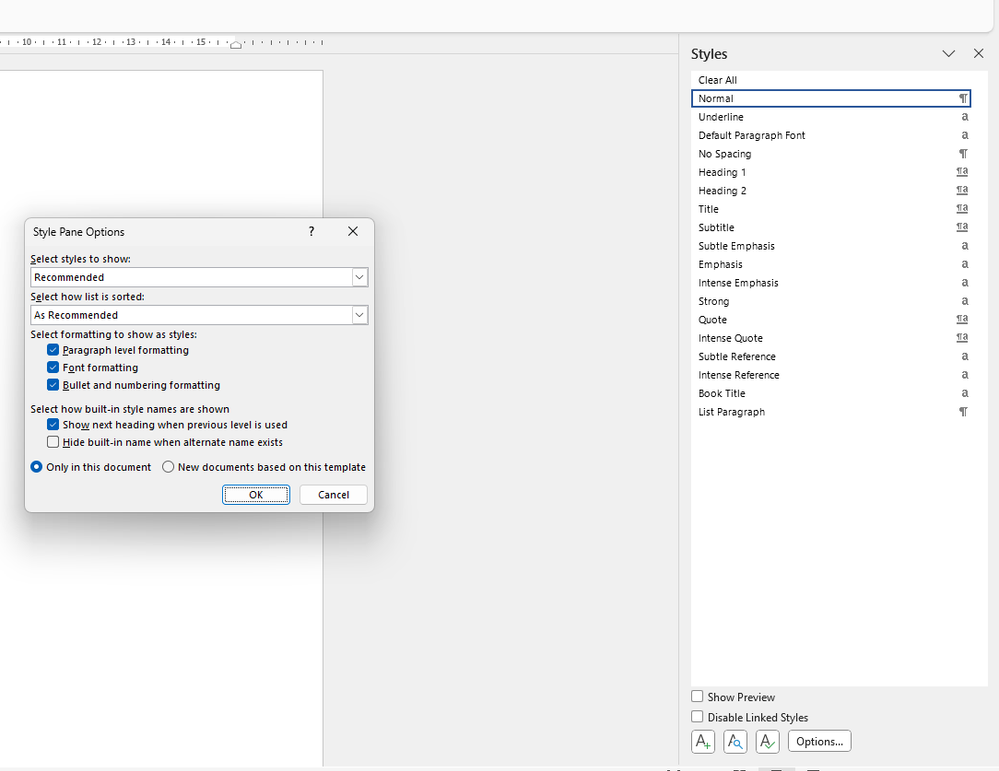 In the Styles pane (Ctrl+Alt+Shift+S), click the Options button and select the three options under Select formatting to show as styles.