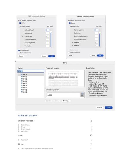 I am struggling with personalizing the Table of Contents. I have developed a recipe book where I have created some Style such as: 1) Chapter Reference (large font size) which is like a Title of a se...