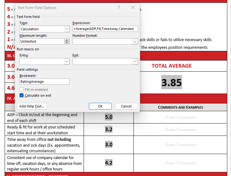 I am making a Job Review Word form that is based off a numerical ratings system. I would like to take the average of all the numerical ratings, currently =Average(ADP,Fit,TimeAway,Calendar) is working great. (see pic)