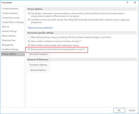 In our environment it seems that this tickbox is ticked by default on all new documents. And this makes all names on comments and such to be removed which is very annoying when collaborating on a file. There must be a way to stop this behavior, and that is really what i am after.