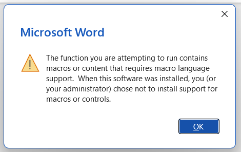I get an error message every time I open Word saying VBA wasn't installed at the time I downloaded Office. Image of the error message screen shotted below.