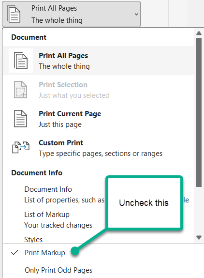 In Word for Windows, you need to click on Print All Pages to even see the Print Markup.