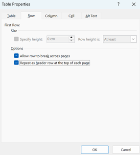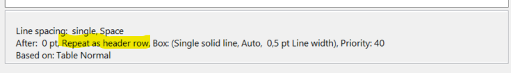 This gives us the "Table Properties" UI in which we in the tab "Row" is given the options to enable "Repeat as header row at the top of each page".