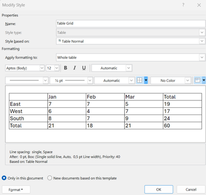 In word you can modify the table styles by for example <right-clicking> a table style and selecting "Modify Table Style"