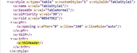 In the resulting XML file (styles.xml) of the .docx file we find it in a <w:trPr> block as a <w:tblHeader/> tag.
