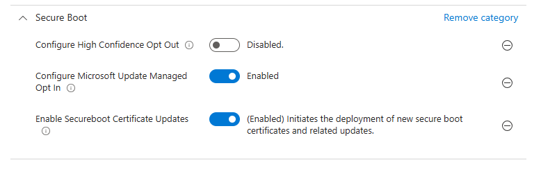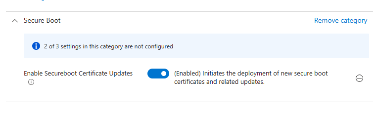 It looks like the new Intune Settings Catalog policies to manage the rollout of the new secure boot certs is not properly working. When trying to deploy the policy it returns an error code 65000, which is a generic error code that intune usually returns for a variety of reasons, sometimes when a pre-req is not met.