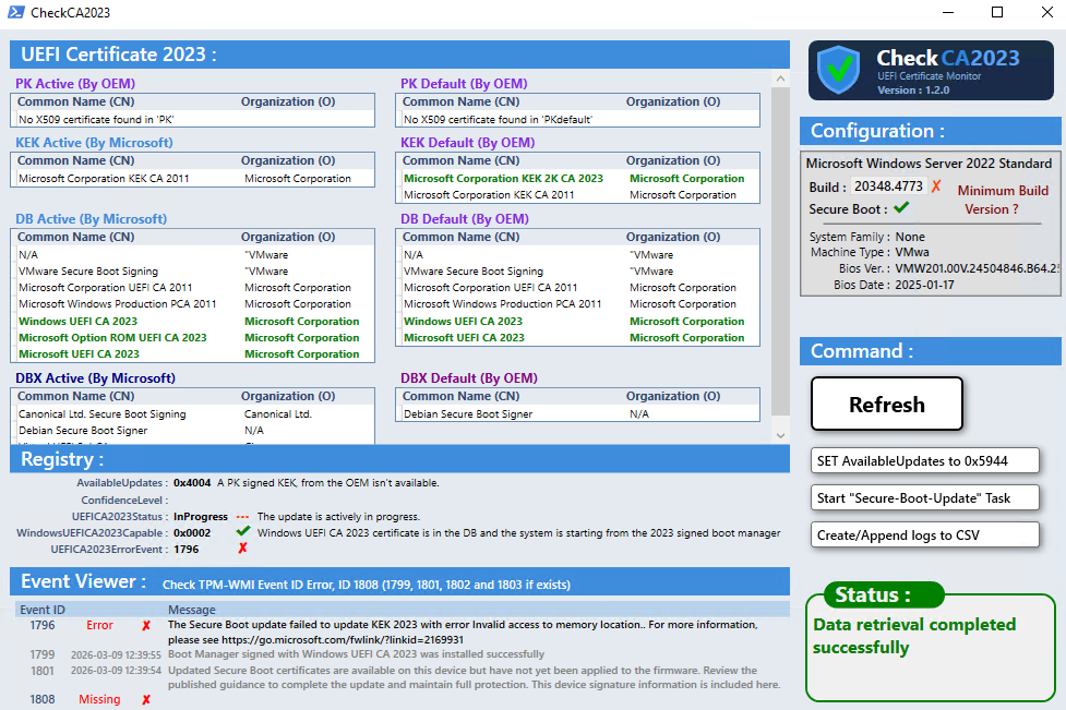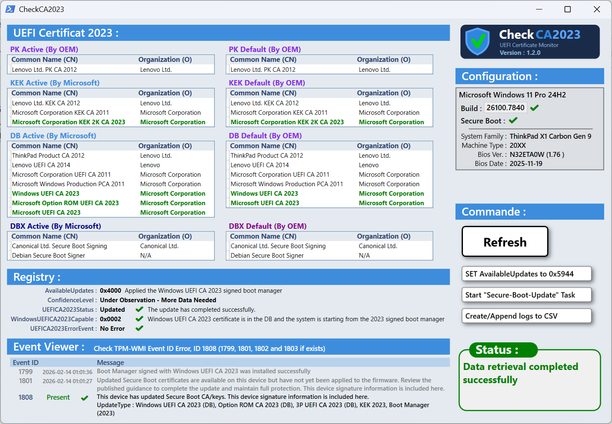 CheckCA2023 — PowerShell + XAML utility that puts all of this in a single graphical interface : Secure Boot certificate stores, registry keys, Event IDs — no command line required 😊
