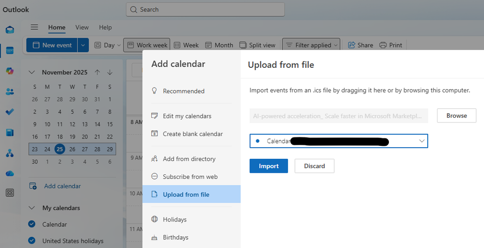 Go to Outlook and open your calendar, then right click the iCalendar file to open with Outlook, you'll see the Add calendar > Upload from file window pop up. (Note: this window won't appear if you are in Outlook email; you must navigate to calendar view.) Choose the calendar to add the event to and select "Import".